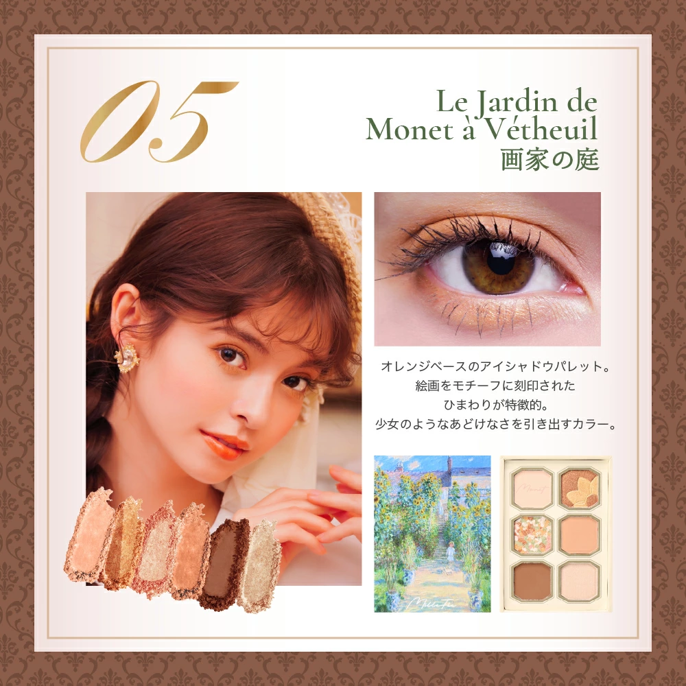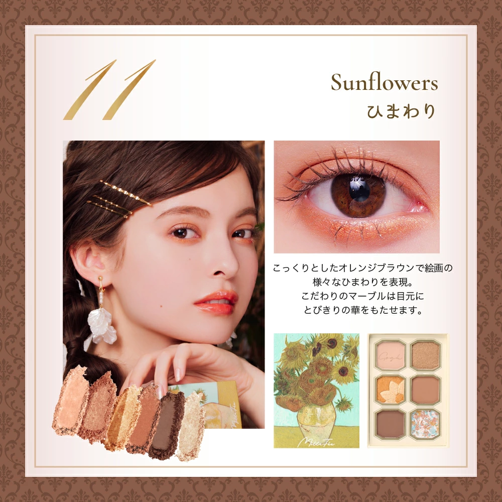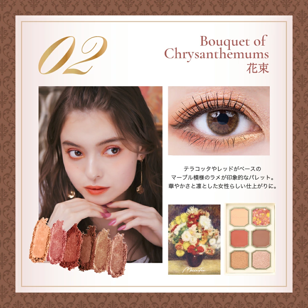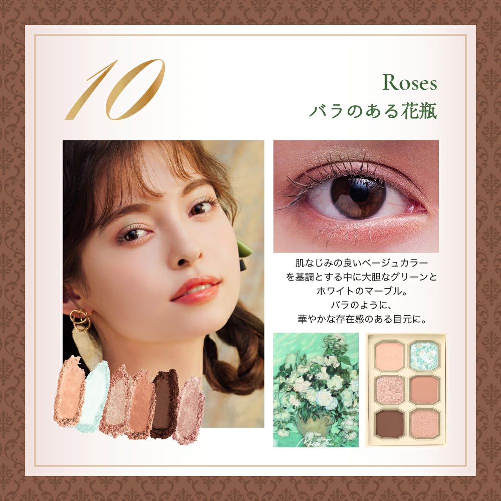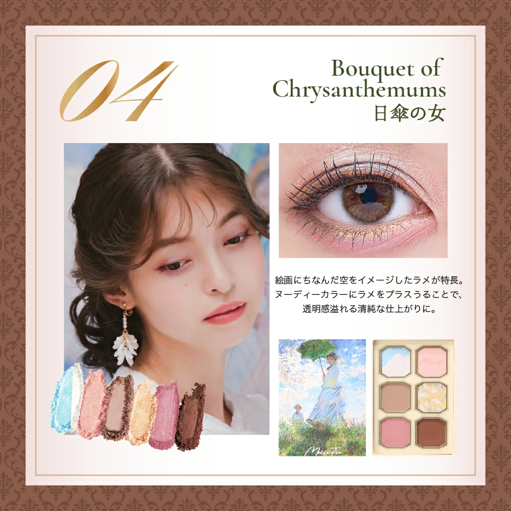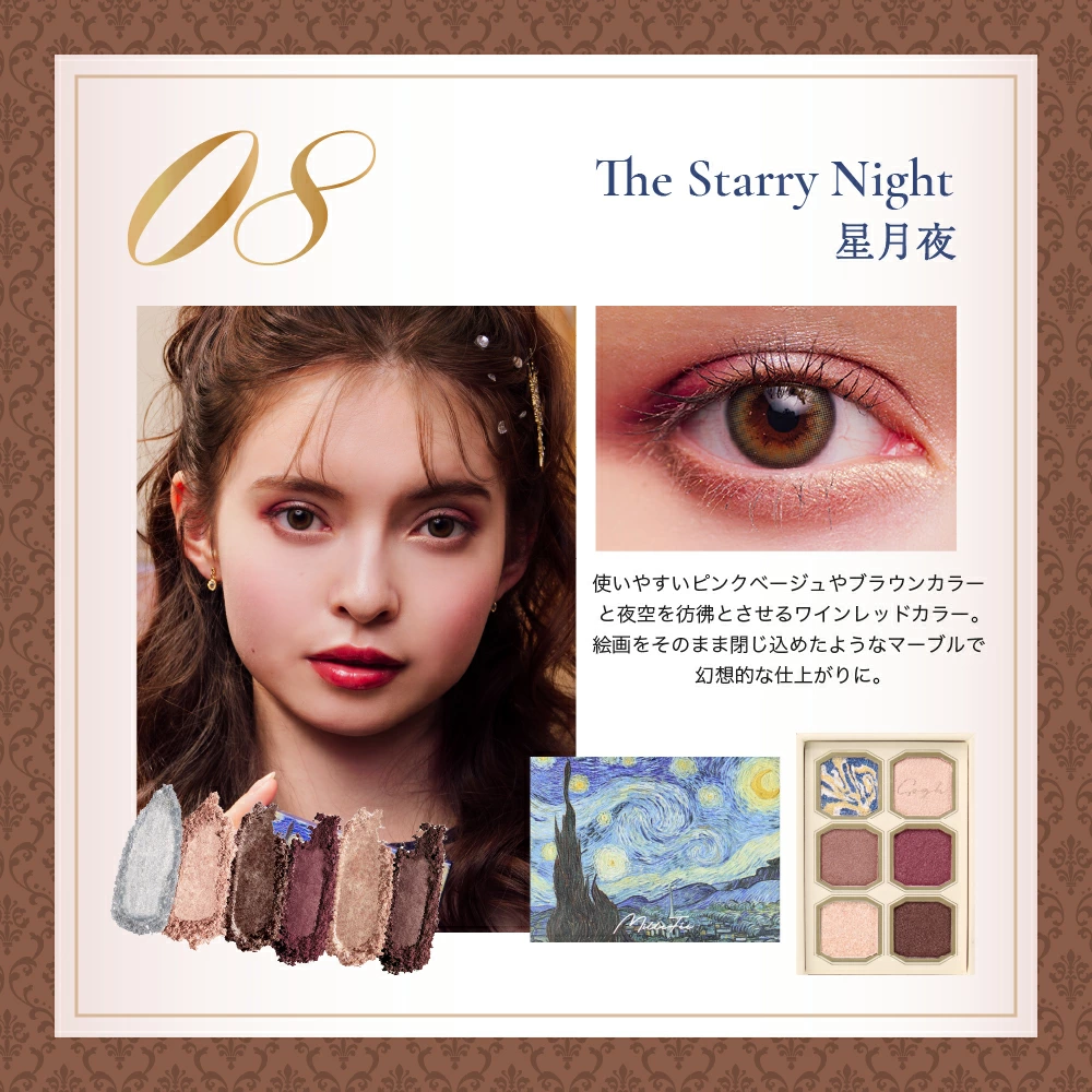 それぞれの作品が持つ独特の色彩や光、そして筆致が、細やかに再現されたアイシャドウとして生まれ変わったのです。