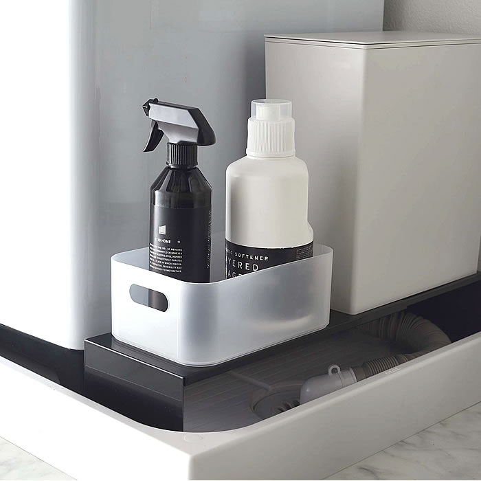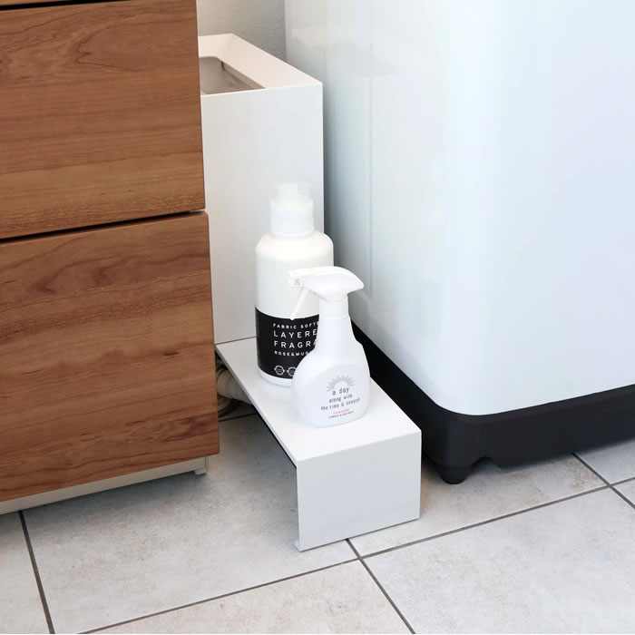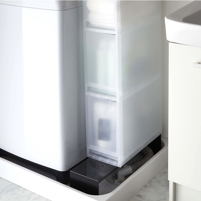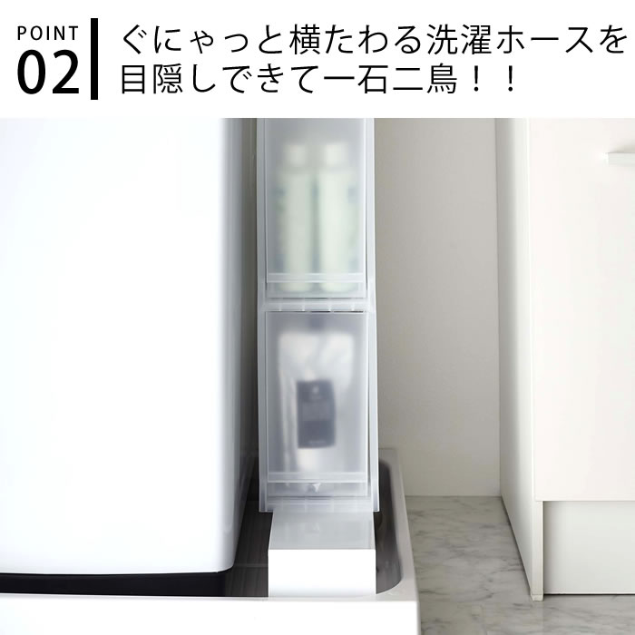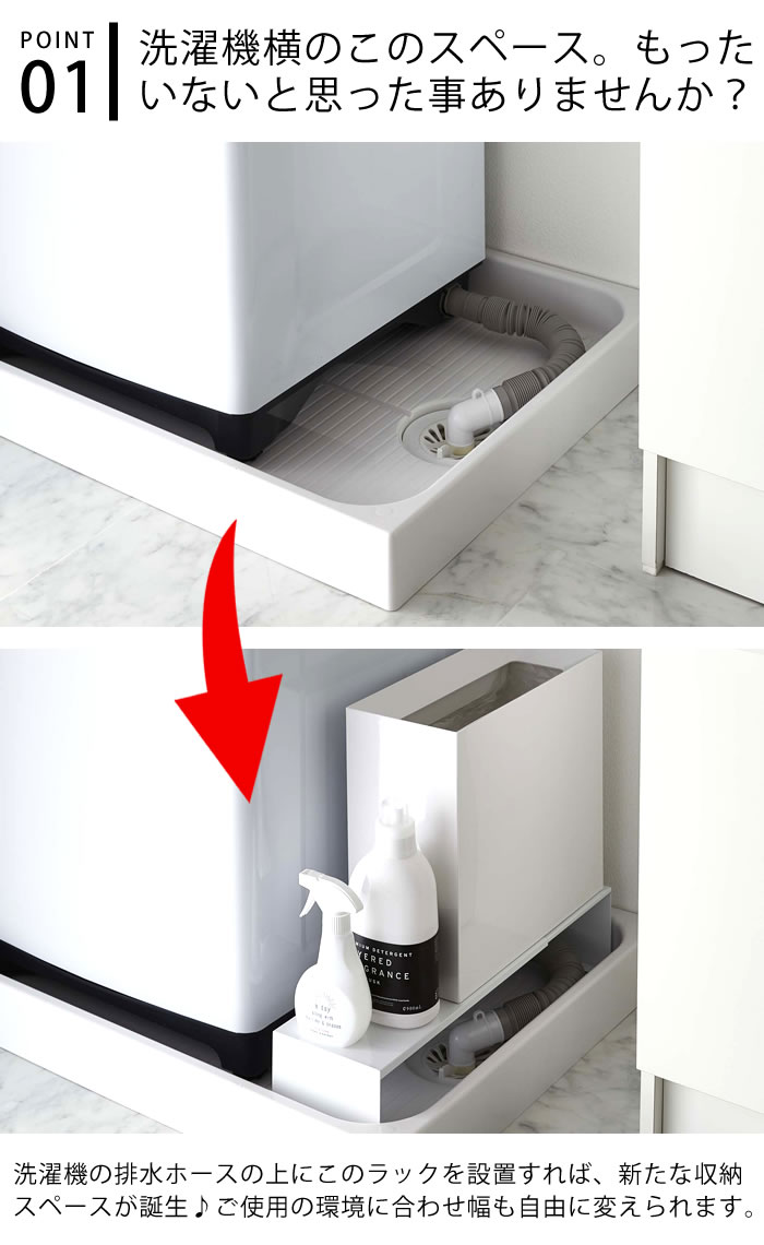 これはなかなかいい発想では。洗濯機の排水ホースの上にスペースを作れる、というもの