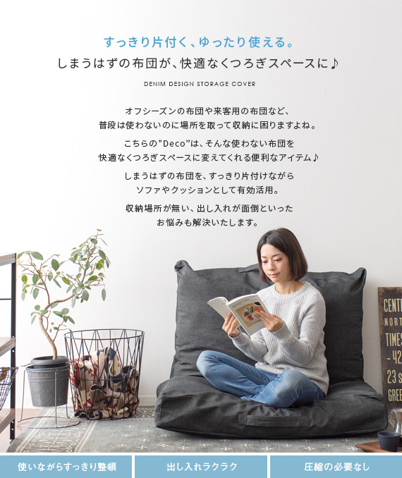 布団をソファ代わりに使える、という布団ケース。これなら使わない季節にソファで使えるので圧縮袋のスペースもなくなりますね