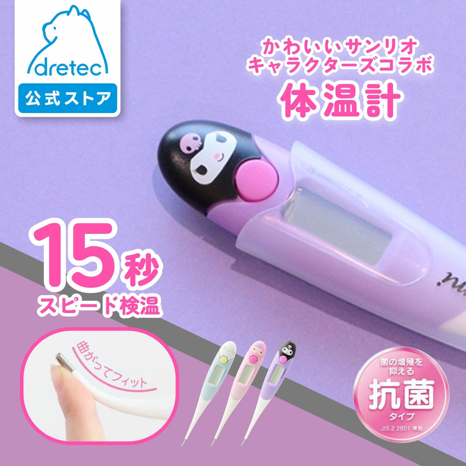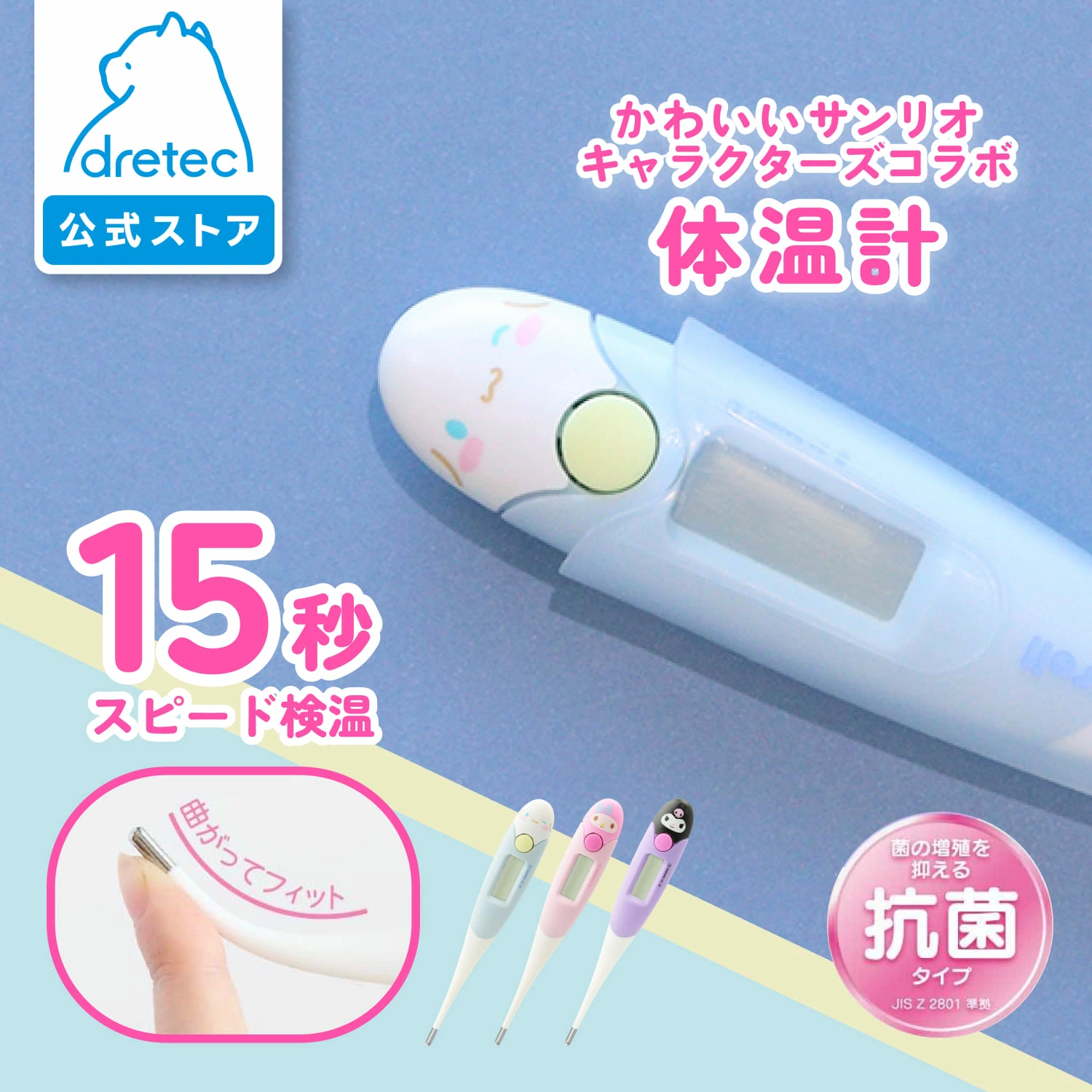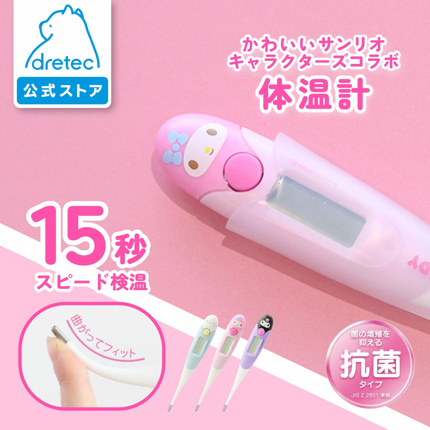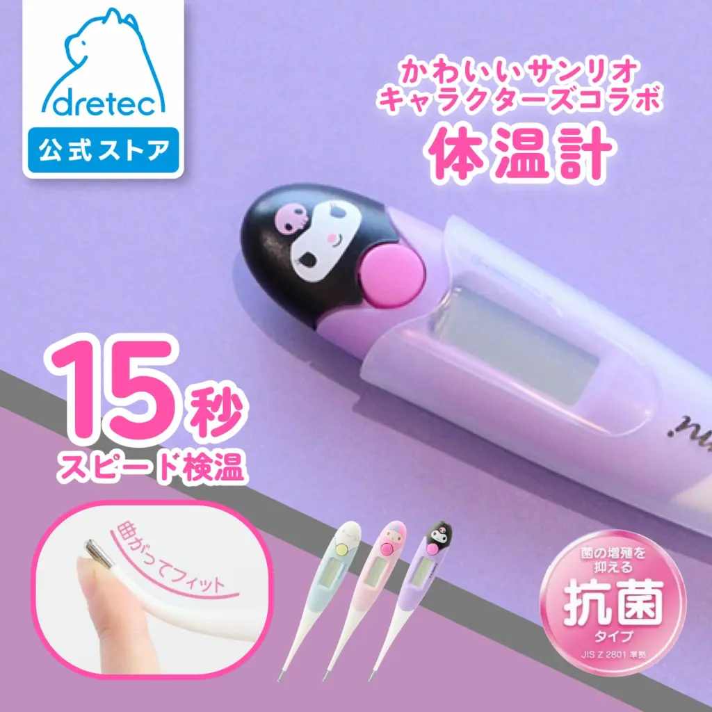 毎日の健康管理を楽しく!サンリオの人気キャラクターのデザイン。体にフィットするdretec製の電子体温計