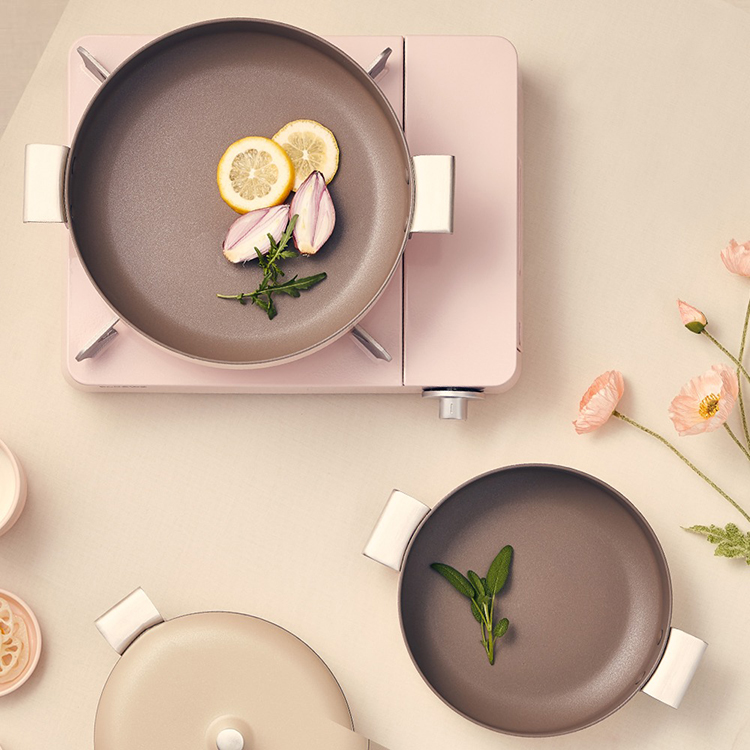 鍋感覚で使える薄型グリルパン。韓国製だそうです。ステンレス製の取っ手となっていて嵩張りにくいのも地味に嬉しい点ですね。