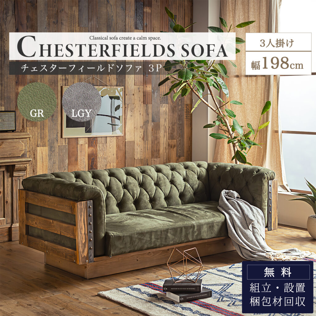 英国アンティークな風格を纏った、高級感を感じさせるシャビーシックなデザインの木製フレームな大人が足を延ばせる広い座面のスエードソファ