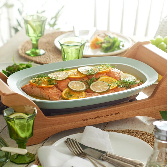 オーバルディッシュのまま調理できる、レトロ感がかわいいToffy製の木製オーバルグリルプレート卓上調理器