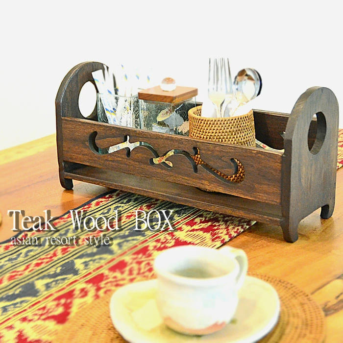 唐草の透かし彫りが印象的な持ち手付きのアジアンリゾート風木製調味料入れ