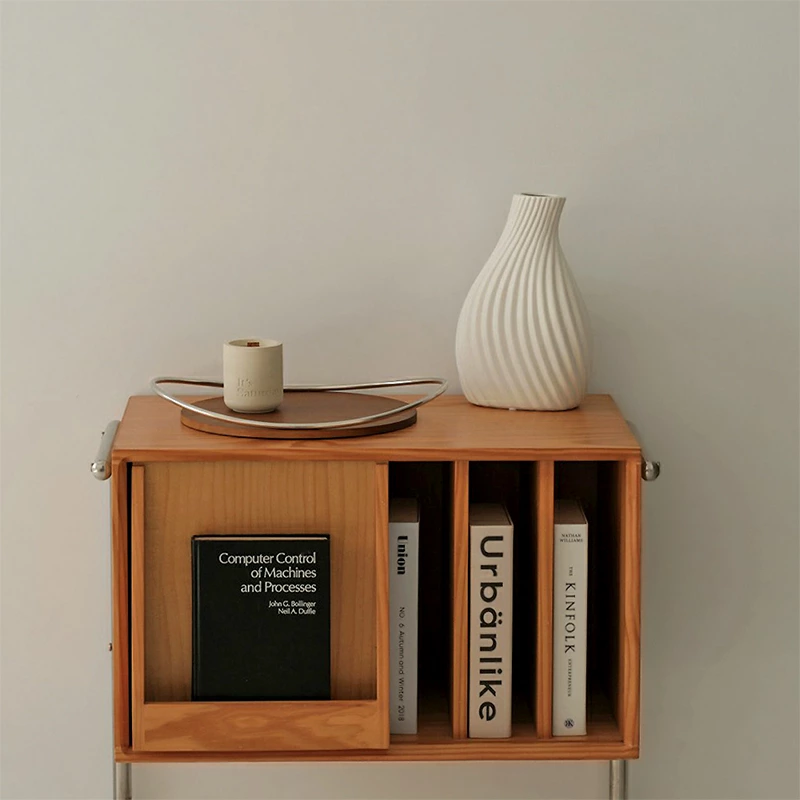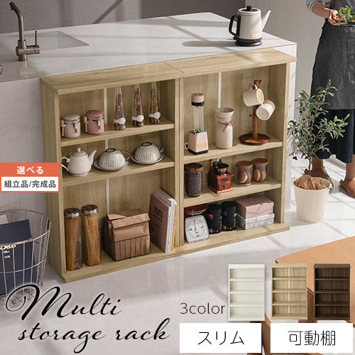 シンプルで汎用的、スリムで場所も取らない木目調の多目的収納棚