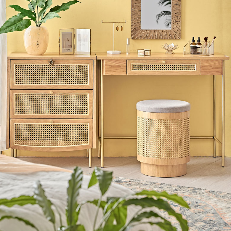 カゴメ編みラタン×ウッドのコンビネーションで上品さと洗練感を放つ リゾートファニチャー「Tilem」製の収納付きスツール
