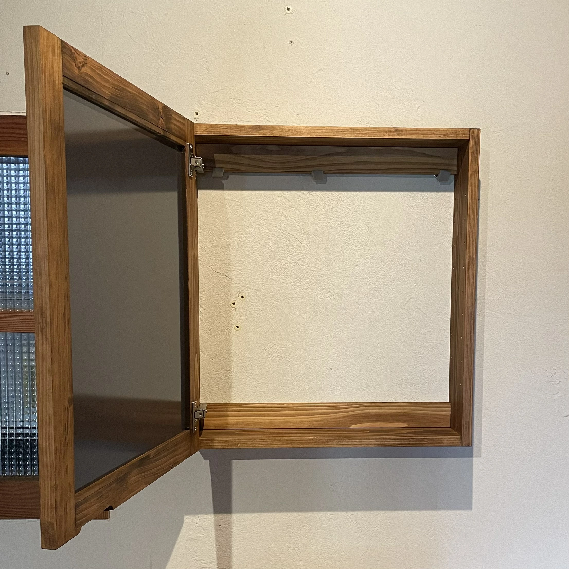 木枠の鏡が扉にもなっており中は小物などを収納できるセミオーダー式のヒノキ木製一枚開き洗面収納棚のご紹介です。
