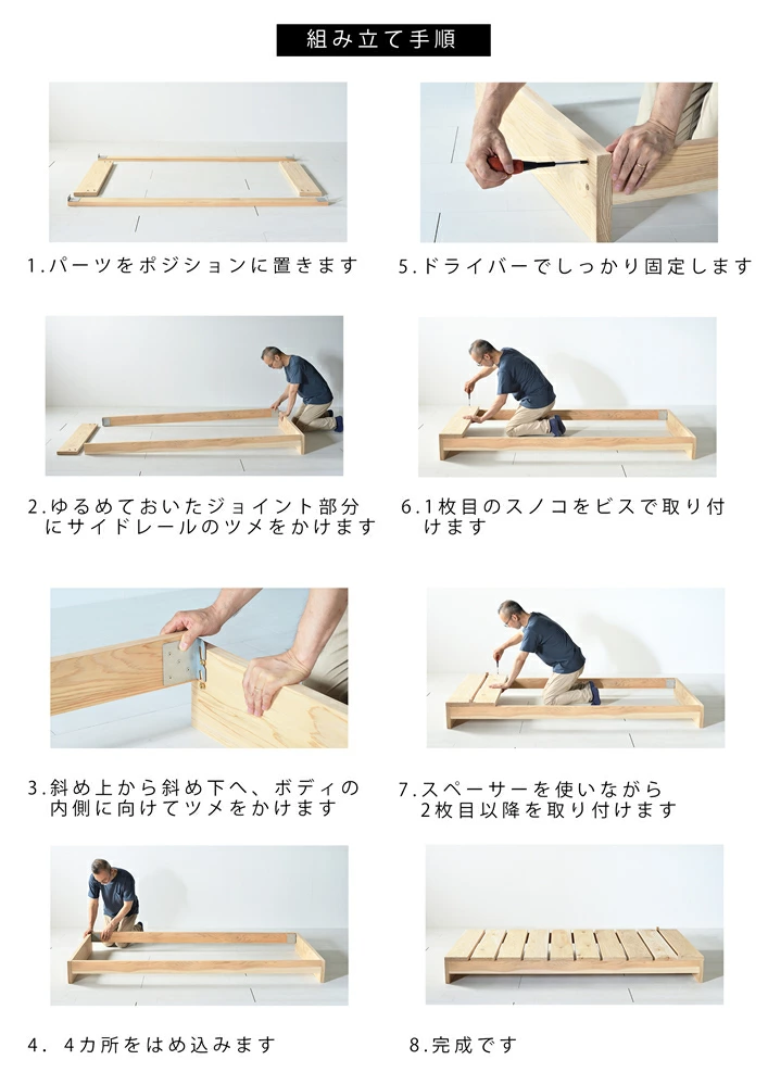 すのこを1枚ずつ電動ドライバーなどでビス止めし、隙間は用意されたスペーサーで測る、という流れでパーツをそれぞれ固定していきます。